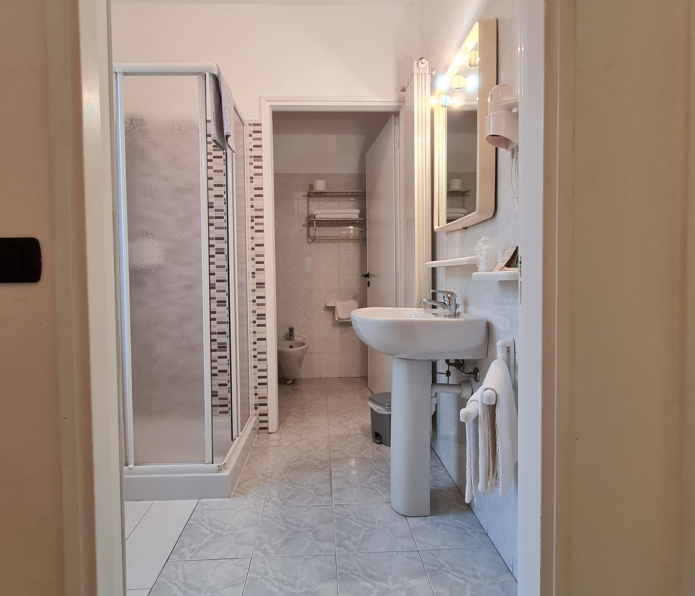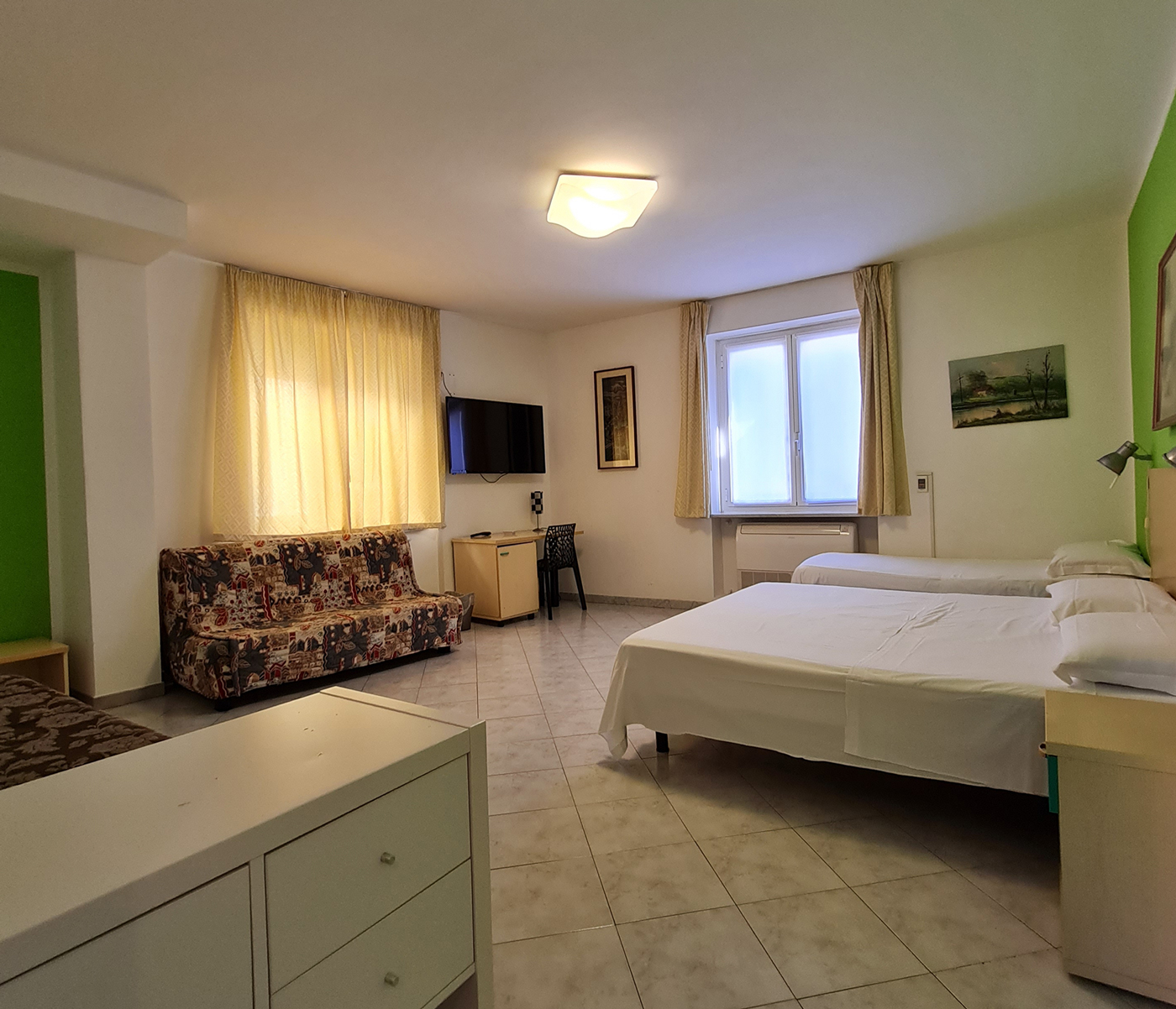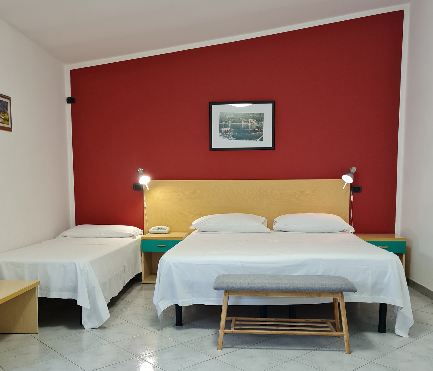 Ogni camera dispone di bagno privato, phon, Wi-fi gratuito, telefono, TV, frigorifero ed aria condizionata. Disponibile anche una camera per disabili, facilmente accessibile al piano.